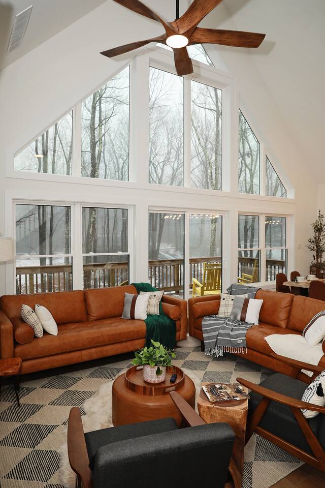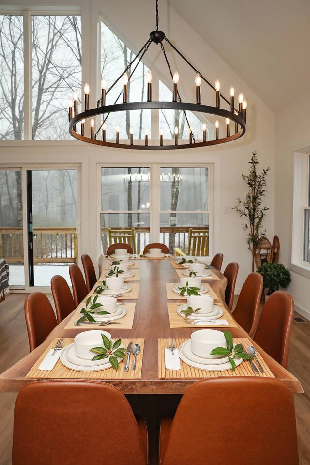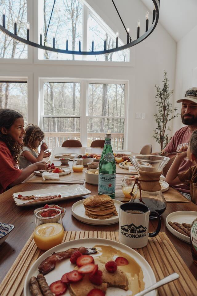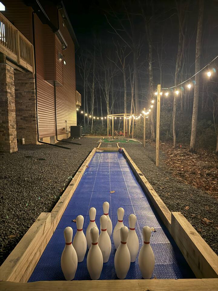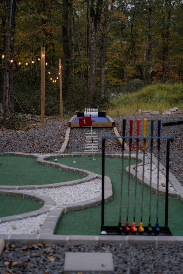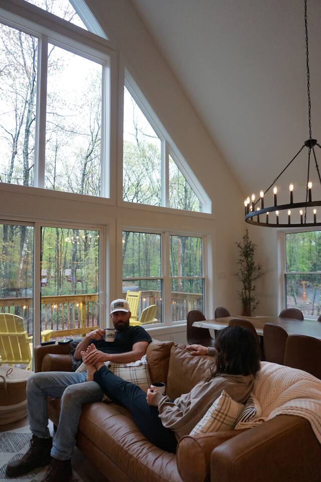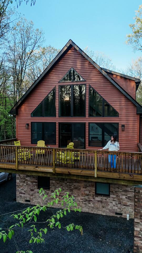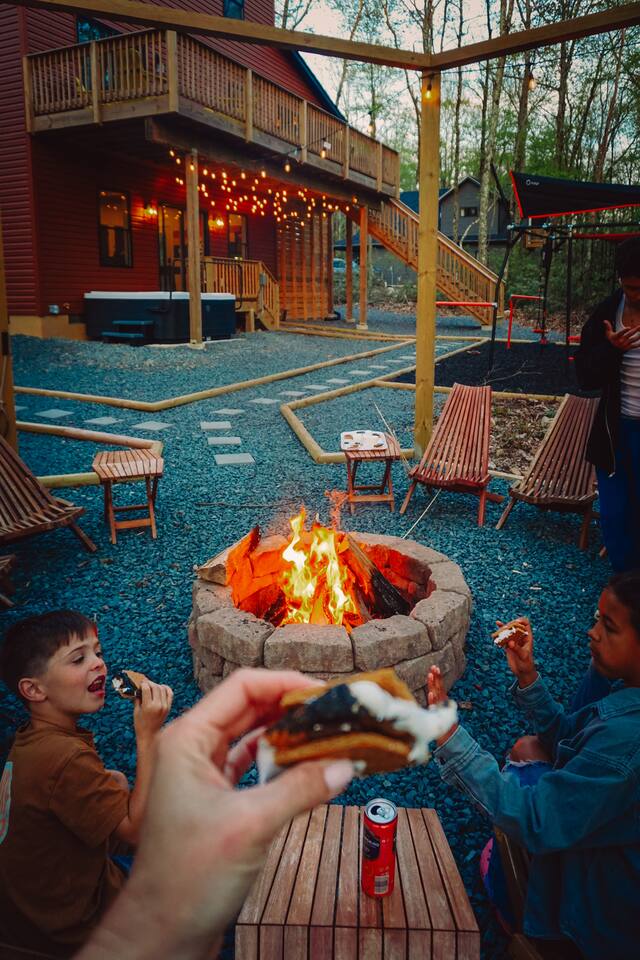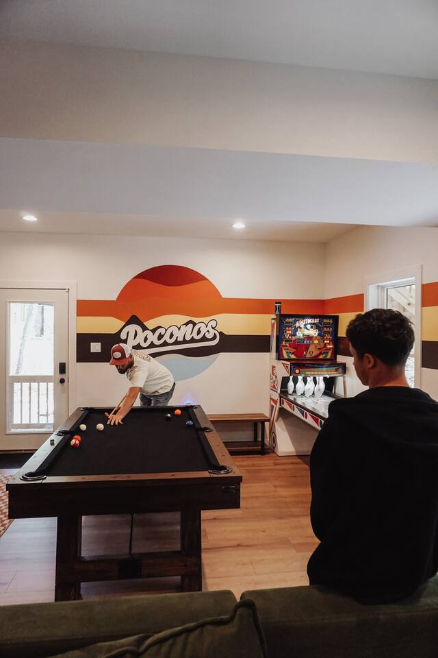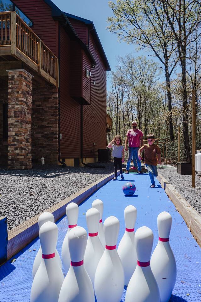 Kiley’s Review ★ ★ ★ ★ ★ August 2025 This house is exactly as described and was perfect for our multi-family vacation. Our family of 14 (8 adults, 5 kids and one dog) fit perfectly in this home, which is thoughtfully set up to host large groups of various ages. Katie was marvelous to coordinate with, and we greatly appreciated how helpful and responsive she was. The kids and adults enjoyed the amenities and the toddler loved seeing the deer every morning from the deck. Guests' Favorite Amenities! ✔ Hot Tub directly off the Deck ✔ 3 Hole Mini Golf ✔ Fire Pit with Seating for 10 for group S'mores roasting ✔ Propane Fireplace on the Deck ✔ Outdoor Bowling ✔ Playset American Ninja ropes course ✔ Pool Table ✔ Nintendo Switch ✔ Vintage Shuffle Board Bowling Arcade ✔ Arcade Game with 12 classic games including Ms. PAC-MAN ✔ Vintage Board Games ✔ Music Loft with Keyboard and Guitars ✔ Brand New 3 Story Modern Mountain Chalet ✔ Soaring Vaulted Ceilings with a Secluded Wooded View ✔ Chef's Kitchen ✔ Master Suite with Deck and Sunset Views ✔ Covered Grilling and Dining Deck for Entertaining ✔ 4 Bedrooms with King Beds (3 Ensuite) ✔ 1 Bunkroom with 1 double and 1 triple bunk ✔ Ceiling Fan in each Bedroom ✔ Roku smart TV's in every bedroom ✔ 86 inch Roku TV in the Game Room ✔ Pack n Play ✔ Controllable Central HVAC Inside, the home is designed for both comfort and entertainment for all ages. Bedrooms & Bathrooms • Each floor features a master ensuite, and every bathroom is accessible from both a bedroom and a common area—perfect for privacy and flexibility. • The first-floor bathroom includes a tub/shower, while the second and third floors have walk-in showers. Sleeping Arrangements • The first floor has a bunk room with a double and triple bunk, great for kids or groups. • The remaining four bedrooms each have a king bed for a restful night's sleep. Kitchen & Living Spaces • The kitchen and main master suite are located on the second floor, with an open-concept living and dining area that leads to a spacious front deck. Outdoor Living • Enjoy the covered deck just off the kitchen, featuring two dining tables with bench seating and a propane grill—perfect for outdoor meals, rain or shine. • The second-floor deck spans the front and rear of the house, offering another great space to take in the surroundings. • The main entrance welcomes you with a ski lift bench, a fun photo op spot! Firewood is also stocked here for your convenience. Entertainment & Leisure • Private hot tub for ultimate relaxation • Fire pit for cozy nights under the stars • Three-hole mini golf • Outdoor bowling • Playset for the little ones This home is designed for gathering, unwinding, and making memories. We can’t wait to host you! ____________________________________ Outdoor Adventures & Activities • Pocono Whitewater - 8 min - Exciting rafting, kayaking, and biking through the scenic Lehigh Gorge. • Lehigh Gorge Trail - 19 min - Rent a bike and enjoy a scenic 25-mile ride along the Lehigh River. • Pocono Outdoor Adventure Tours - 21 min - UTV rides through scenic mountain trails, ages 5+ can ride! • Delaware Water Gap - 48 min - Stunning waterfalls, river paddling, and Mt. Tammany hikes. ____________________________________ Skiing & Snowboarding Resorts • Jack Frost & Big Boulder Ski Resort - 19 min - Scenic skiing, snowboarding, and tubing by day and night. • Camelback Resort - 39 min - Year-round adventure with skiing, waterparks, ziplining, and more! • Blue Mountain Ski Resort - 39 min - Home to Pennsylvania’s highest vertical drop, plus hiking & biking. ____________________________________ Scenic & Nature Parks • Austin T. Blakeslee Natural Area - 23 min - Scenic trails, serene waterfalls, and peaceful fishing spots. • Hickory Run State Park - 21 min - Home to breathtaking waterfalls and the world-famous Boulder Field. • Bear Mountain Butterfly Sanctuary - 9 min - Walk among free-flying butterflies and interactive exhibits. ____________________________________ Historic & Sightseeing Attractions • Historic Jim Thorpe - 19 min - Quaint streets, boutique shops, and 19th-century architecture. • Lehigh Gorge Scenic Railway - 19 min - Breathtaking train rides through cliffs, forests, and mountains. • Jim Thorpe Trolley Co. - 19 min - Dog-friendly guided tours of Jim Thorpe’s rich history and architecture. ____________________________________ Family Fun & Entertainment • Kalahari - 37 min - America’s largest indoor waterpark, plus dining, spa, and entertainment. • Penn’s Peak - 15 min - Live concerts, dining, and stunning panoramic mountain views. • Skirmish Paintball - 18 min - One of the world’s largest paintball fields with 750+ acres and 50+ themed maps. ____________________________________ Horseback Riding • Deer Path Riding - 18 min - Peaceful, guided horseback rides for ages 7+, no experience needed. • Mountain Creek Riding Stable - 43 min - Scenic guided trail rides for all skill levels. ____________________________________ Food & Drink • Pocono Organics Café - 20 min - Farm-to-table café offering fresh, organic meals and smoothies. • Boulder View Tavern - 17 min - Delicious food, lakefront views, and a dog-friendly patio. • Reilly’s Produce - 9 min - Farm-fresh fruits, vegetables, and local goods straight from the Poconos. ____________________________________ Motorsports & Racing • Pocono Raceway - 21 min - NASCAR races, thrilling events, and drive-the-track experiences. ____________________________________ Perfect adventures for every season—book your stay now!