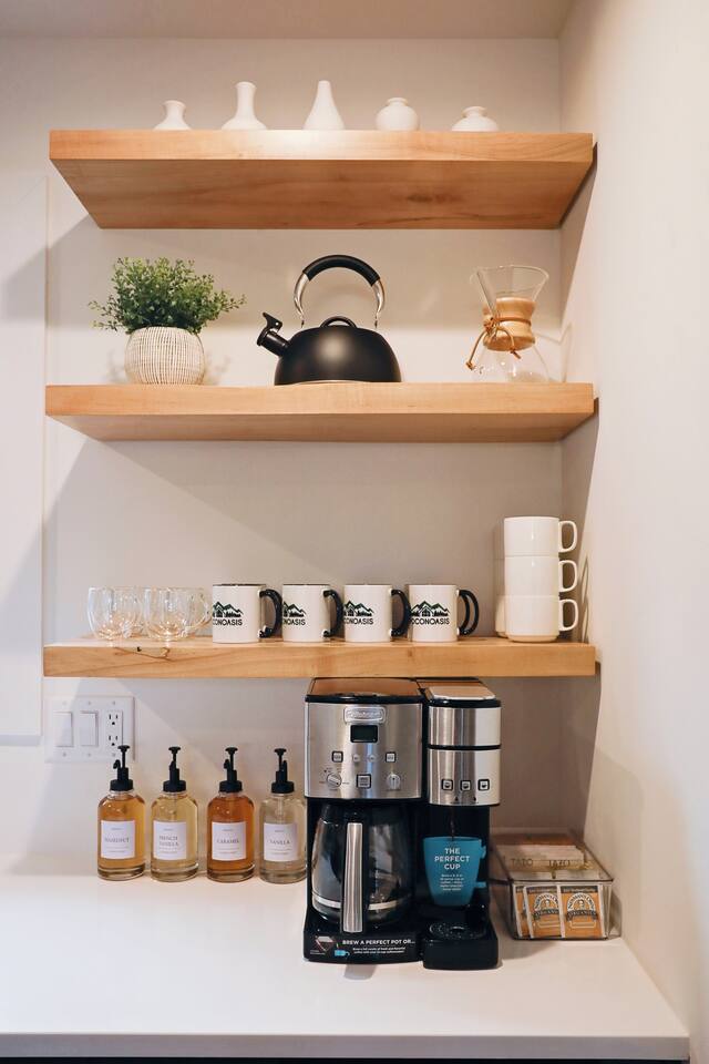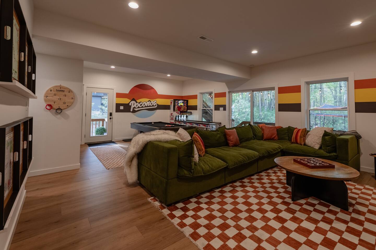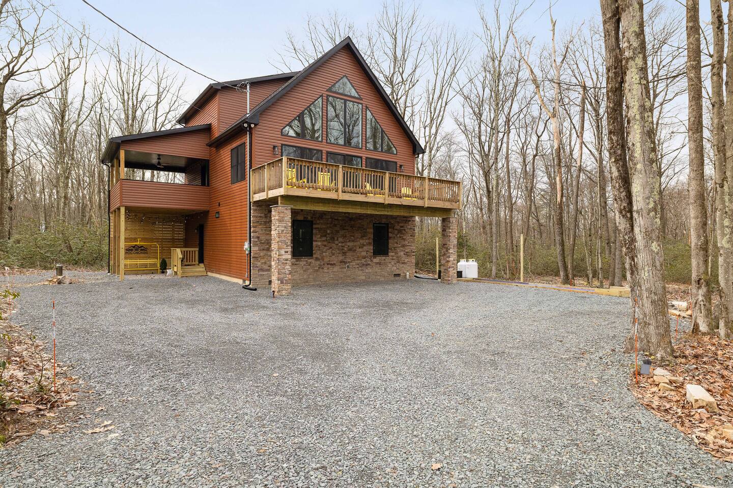 Welcome to Poconoasis! This modern chalet is nestled in the woods of a peaceful lake community, perfect for families and friends. Enjoy skiing, white-water rafting, boating, hiking, swimming, and the nearby historic town of Jim Thorpe, plus shopping and dining. Experience spacious living areas and plenty of seating for everyone to enjoy togetherness. Relax in the hot tub, play in the rec room, or unwind in four king bedrooms. The bunk room is fun and cozy for kids after their adventures.